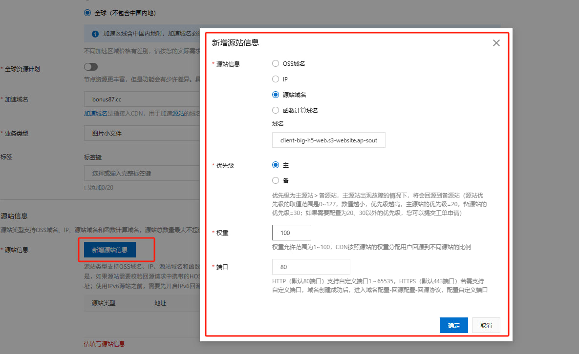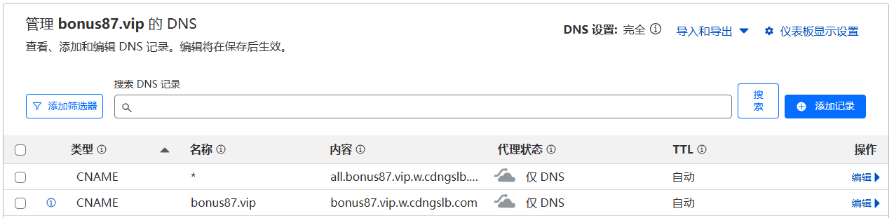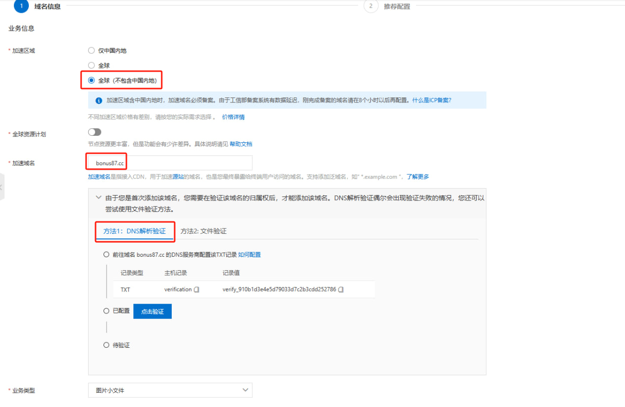 2、域名信息--->加速区域:全球(不包含中国内地)--->加速域名(填写要加速的域名)--->dns解析验证--->在cloudflare中添加仅dns解析