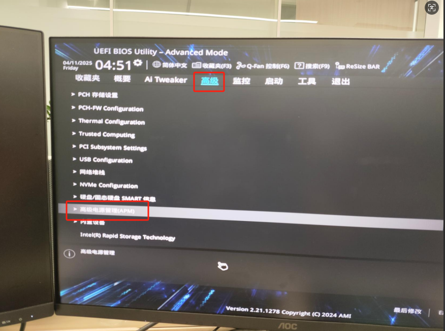 - 选择高级->高级电源管理按下enter键(根据BIOS的不同可能名字不同,设置一样找到电源设置)