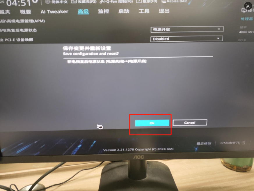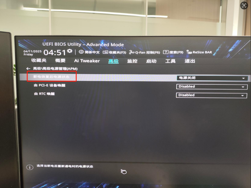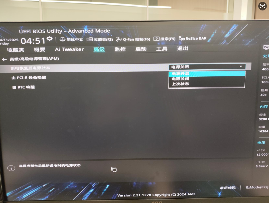 - 选择断电恢复后电源状态,并将参数选择为电源开启